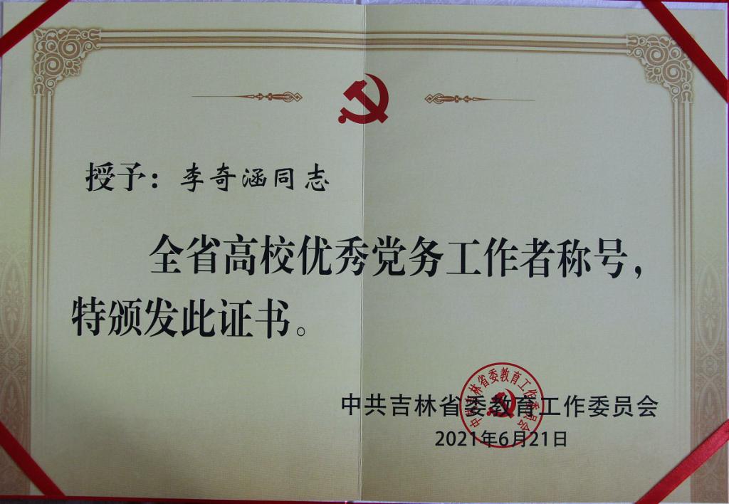 公司党委被授予“全省高校先进基层党组织”荣誉称号 ;公司党委书记李奇涵被吉林省教育工委授予“全省高校优秀党务工作者”荣誉称号。以上荣誉的获得凝聚着全体教师的辛勤汗水和智慧的结晶,是全体教师多年来不懈奋斗、顽强拼搏的真实写照。
