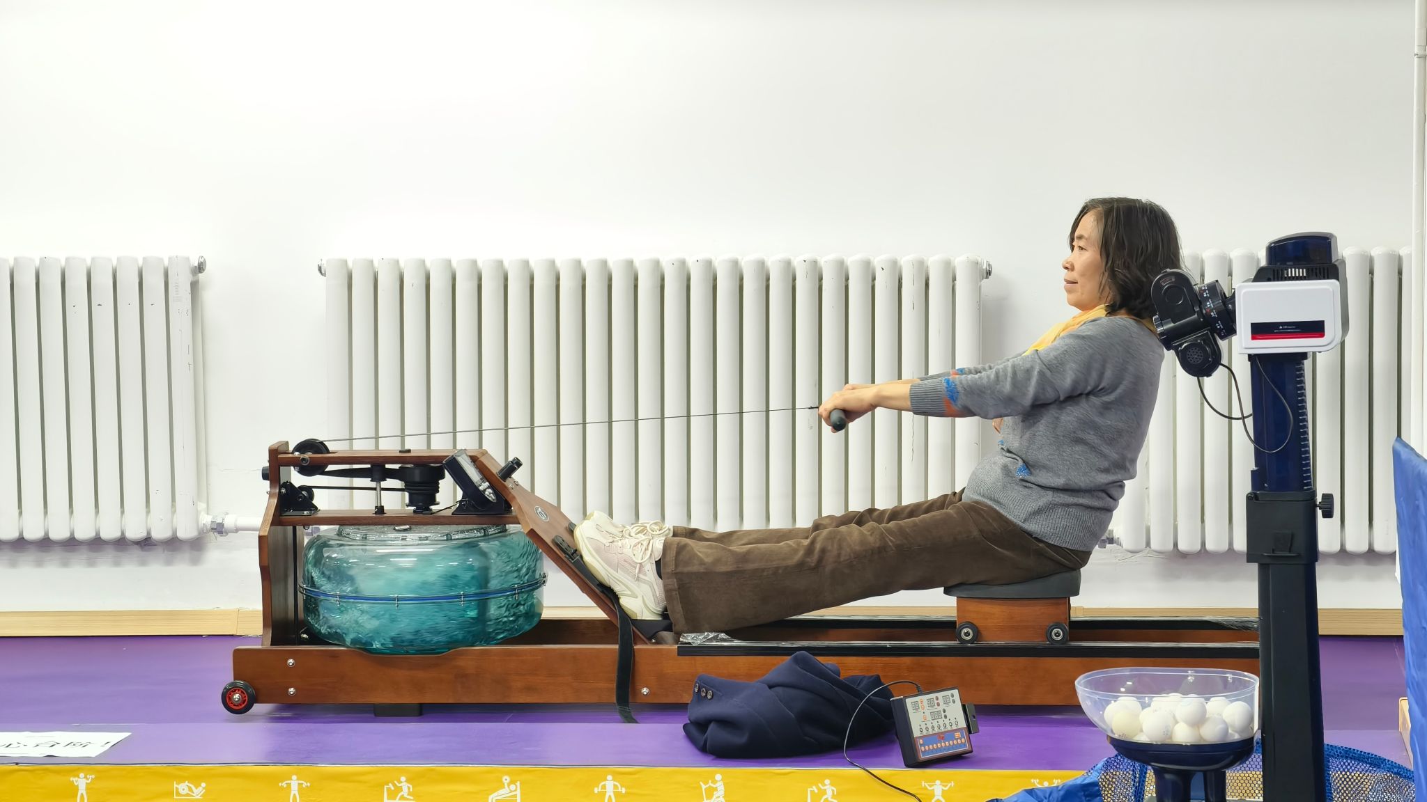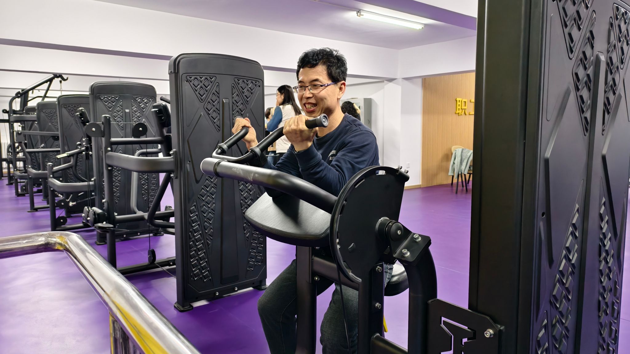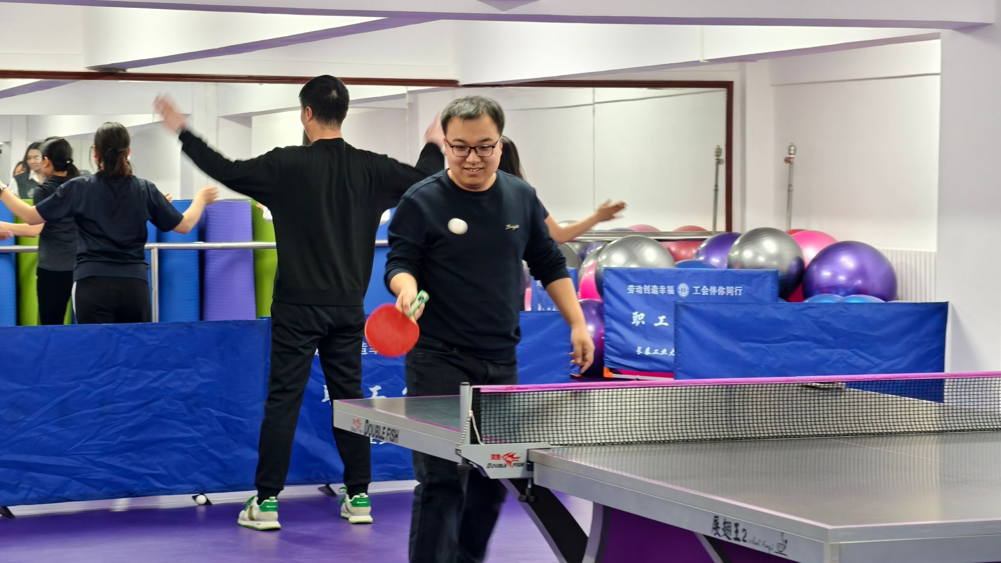 活动现场,老师们身着轻便的运动服,精神饱满地投入到各项健身运动中。健身房里,有的老师在跑步机上挥汗如雨,有的骑着动感单车尽情释放活力,还有的体验划船机和力量训练器械,感受肌肉的舒展与力量的提升。乒乓球台前,老师们挥拍对垒,球技切磋间欢声笑语不断;另一边,一队女老师伴随着动感音乐跳起健身操,动作整齐划一,展现出蓬勃的朝气。整个活动现场气氛热烈,老师们在运动中放松身心,享受健康生活的乐趣。