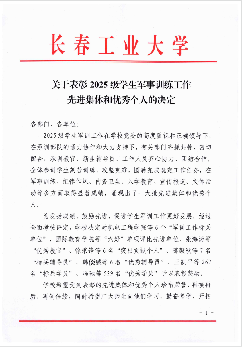 本网讯(通讯员 姜鸿乔)近日,公司公布了《关于表彰2025级员工军事训练工作先进集体和优秀个人的决定》,公司获军训工作标兵单位,“六好”单项评比先进单位、标兵辅导员、标兵学员、优秀学员等多项荣誉。